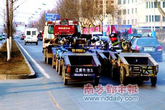 南方都市報消息: 3月2日,石家莊市勝利北街出現(xiàn)一幕清障車“一拖十”的壯觀畫面。一輛清障車拖著十余輛電動三輪車在路上行駛,路上行駛的車輛紛紛躲避。