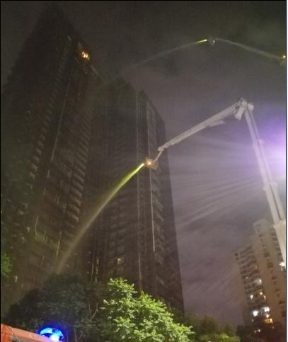不久,現(xiàn)場消防車增至22輛、消防官兵增至110多名。兩臺消防高噴車在外圍控制了火勢蔓延。消防員攜帶救援器材,繼續(xù)徒步上樓,逐層內(nèi)攻搜索排查。至21時(shí)45分,火災(zāi)被完全撲滅。